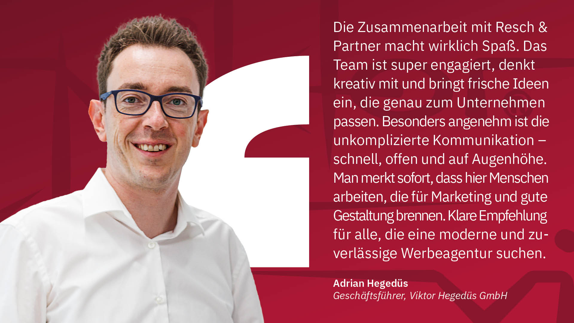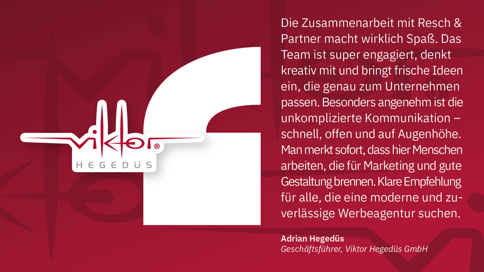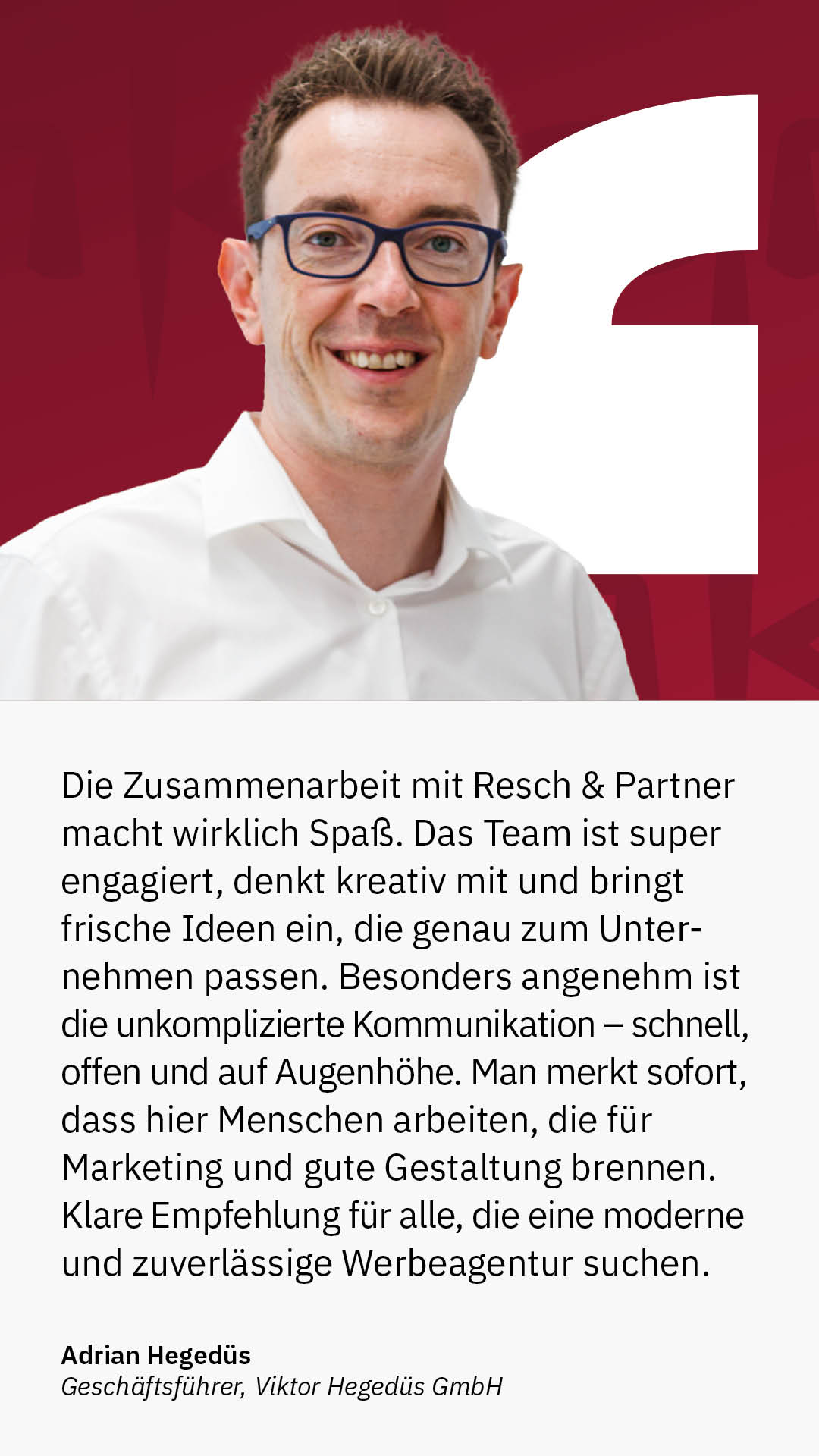 In unserem Team bei Resch & Partner entwickeln wir Marken, Corporate Designs, Kampagnen, Websites und Messeauftritte. Einige Kunden betreuen wir in Spezialdisziplinen, andere Kunden wiederum nutzen das komplette Know-how unserer crossmedialen Agentur. Wie auch immer Sie sich entscheiden, Resch & Partner ist Ihr kompetenter und leistungsstarker Partner.